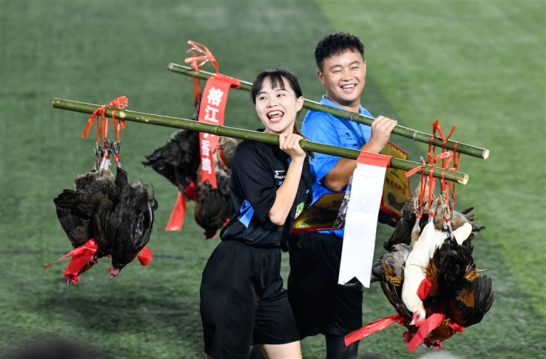 2023年7月29日,裁判員展示貴州“村超”執(zhí)裁獎(jiǎng)品——榕江小香雞。 新華社記者 楊文斌 攝