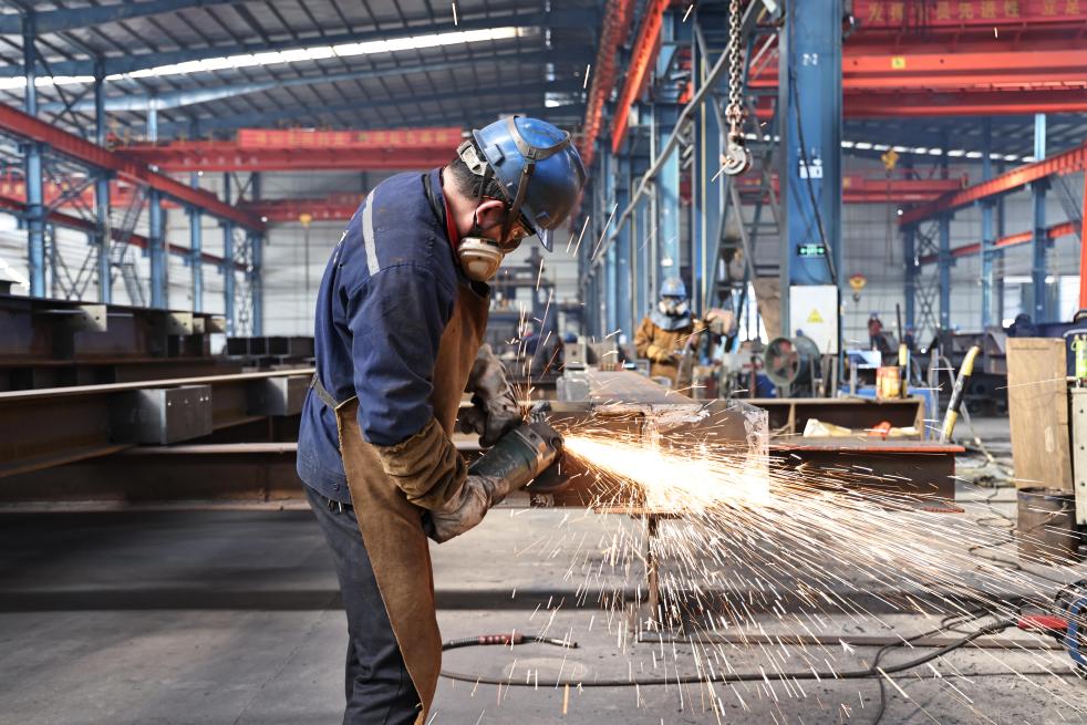 ??在位于瑞金市的江西昊宇重工有限公司生產(chǎn)車間內(nèi),工人正在進(jìn)行切割作業(yè)。(楊鑫 攝)