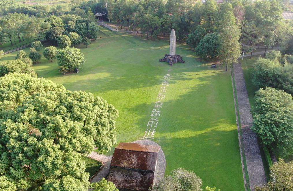 ??2024年9月,江西省瑞金市葉坪紅軍廣場(chǎng),瑞金紅軍烈士紀(jì)念塔巍然聳立,地面上有“踏著先烈血跡前進(jìn)”八個(gè)遒勁大字(無(wú)人機(jī)照片)。新華社記者 余剛 攝