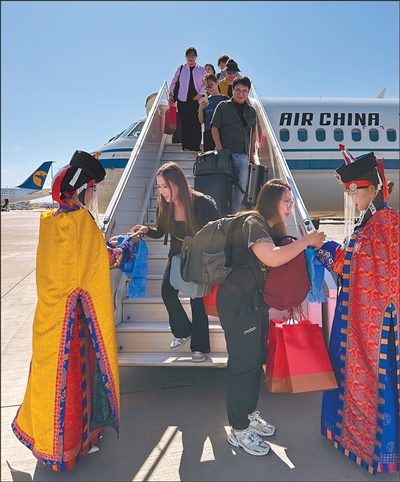 圖為工作人員身著民族盛裝歡迎乘客。本報記者 張朋輝 攝