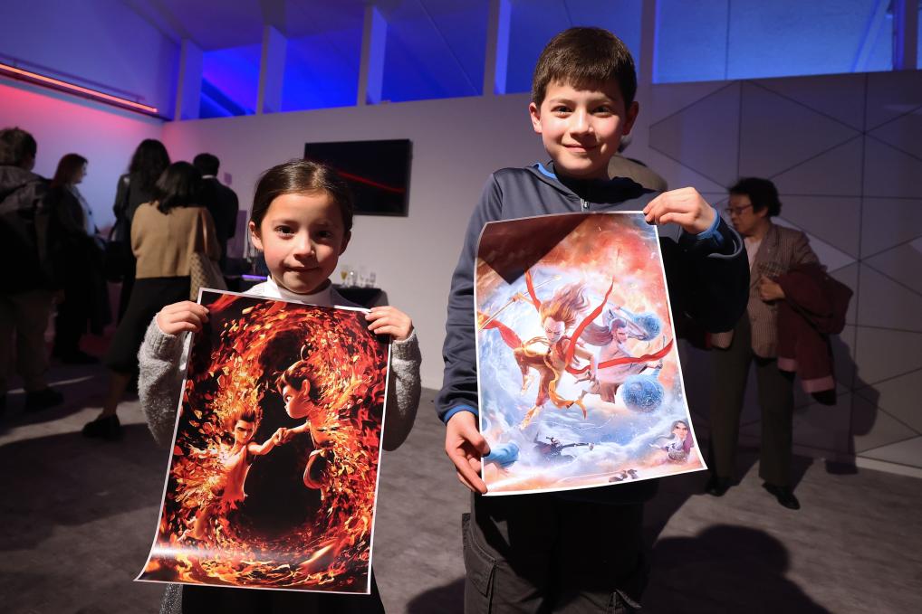 3月26日,在比利時布魯塞爾,小朋友在《哪吒之魔童鬧?!肥子郴顒由鲜殖趾蠛嫌?。新華社記者趙丁喆攝