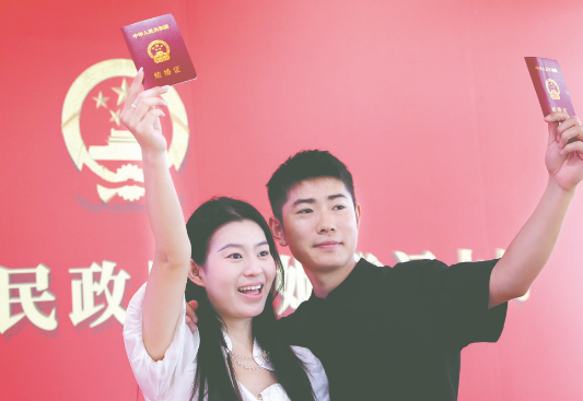 8月29日,一對新人在河南省濟(jì)源市民政局婚姻登記大廳領(lǐng)證后合影留念。