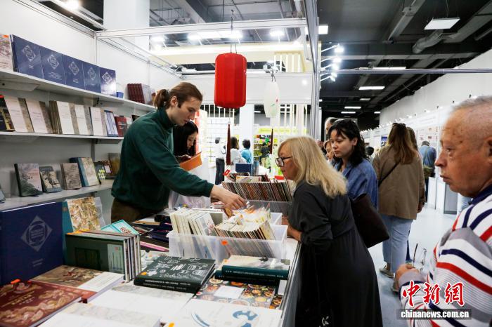 當(dāng)?shù)貢r(shí)間9月4日,莫斯科全俄展覽中心,讀者在第38屆莫斯科國際書展尚斯國際出版集團(tuán)展臺(tái)挑選中國傳統(tǒng)文化俄譯本圖書。中新社記者 田冰 攝