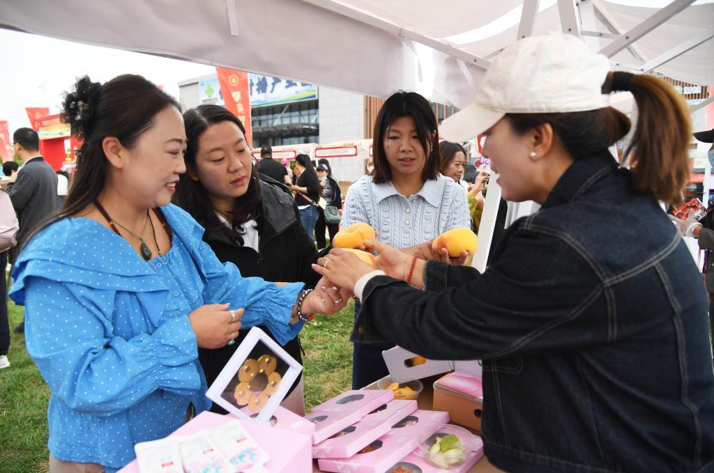 9月19日,北京市平谷區(qū)舉辦2025年中國農民豐收節(jié)暨第36屆北京農民藝術節(jié)“鄉(xiāng)村大舞臺”平谷區(qū)專場展演。工作人員(右一)在活動現場向市民介紹農產品。新華社記者 任超 攝