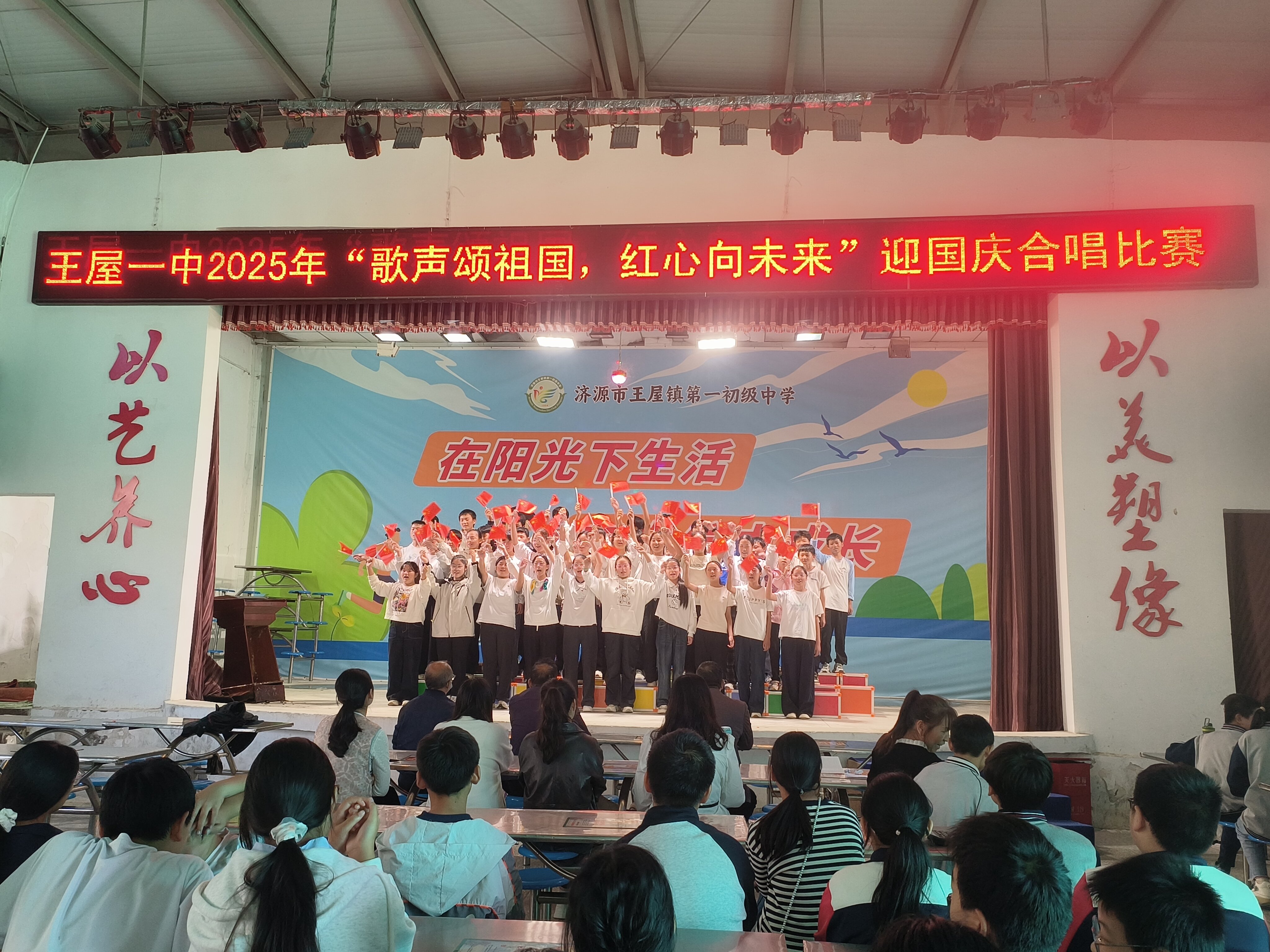 金秋送爽,紅旗飄揚(yáng)。9月30日,王屋一中餐廳舞臺(tái)燈火璀璨,“歌聲頌祖國(guó),紅心向未來(lái)”迎國(guó)慶合唱比賽在此熱烈舉行,全校師生齊聚一堂,用嘹亮歌聲為祖國(guó)76華誕獻(xiàn)禮。