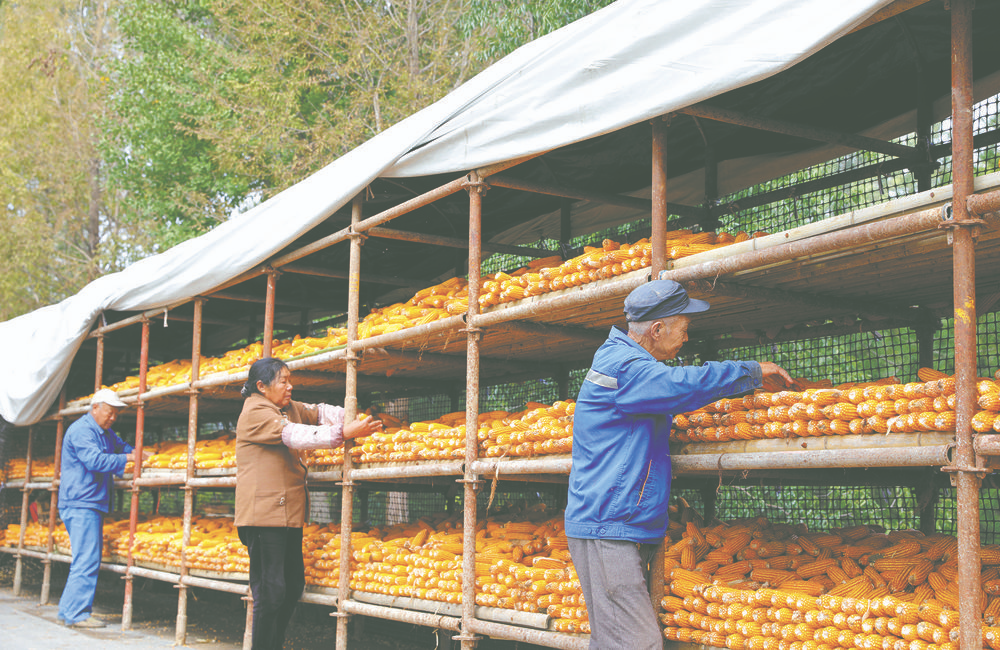 10月14日,在河南省濟(jì)源市軹城鎮(zhèn)中王村,村民將收獲的玉米上架晾曬。