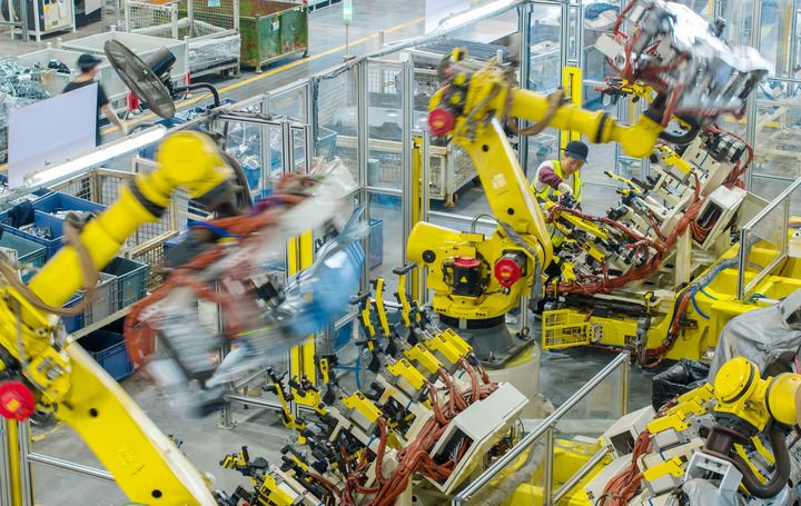 2025年10月9日,浙江省湖州市長(zhǎng)興經(jīng)濟(jì)技術(shù)開發(fā)區(qū)一家汽車部件有限公司的技術(shù)人員操控工業(yè)機(jī)器人生產(chǎn)新能源汽車配件(無(wú)人機(jī)照片)。新華社發(fā)(譚云俸攝)