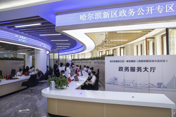 2022年7月12日,市民在黑龍江省哈爾濱新區(qū)江北一體發(fā)展區(qū)(自貿(mào)試驗(yàn)區(qū)哈爾濱片區(qū))政務(wù)服務(wù)大廳辦理業(yè)務(wù)。新華社記者 張濤 攝