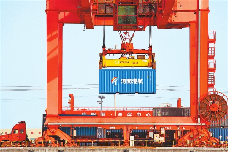 圖② 信陽港·淮濱中心港區(qū),起重機在裝運集裝箱。 王長江 攝