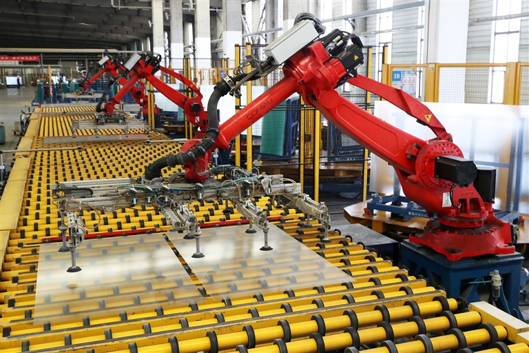 在位于襄城縣的許昌安彩新能科技有限公司,工業(yè)機(jī)器人在生產(chǎn)線上精細(xì)作業(yè)。 牛書(shū)培 攝