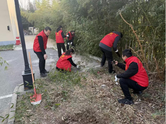 活動現(xiàn)場,黨員志愿者們熱情高漲,分工協(xié)作,紛紛拿起鋤頭、鐵鍬、手套等工具,投入到熱火朝天的勞動中。大家重點對菜地區(qū)域及周邊滋生的雜草、雜竹進行了徹底清除。志愿者們或俯身徒手拔草,或揮動鋤頭松土,或清理搬運枯枝雜物,不放過任何一個衛(wèi)生死角。盡管天氣寒冷,但大家干勁十足,充分發(fā)揚了不怕臟、不怕累的團結(jié)協(xié)作精神。經(jīng)過數(shù)小時的辛勤勞作,餐廳旁的土地面貌煥然一新,原本雜亂的草叢和竹叢被清理得干干凈凈,土地得到了平整和疏松,為接下來的土壤休整和春季作物種植創(chuàng)造了良好條件。