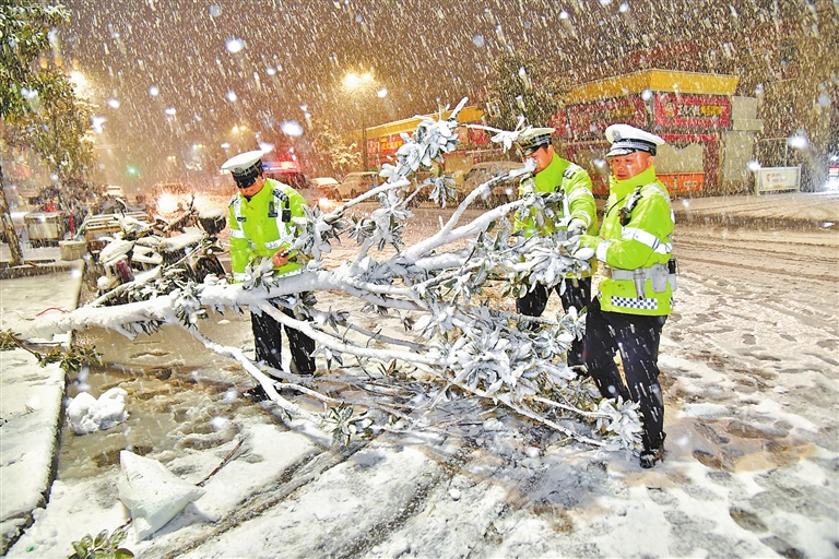雨雪天氣來襲,洛陽市公安局交通管理支隊民輔警在路面清除樹障,保障群眾出行安全。田貝貝 攝