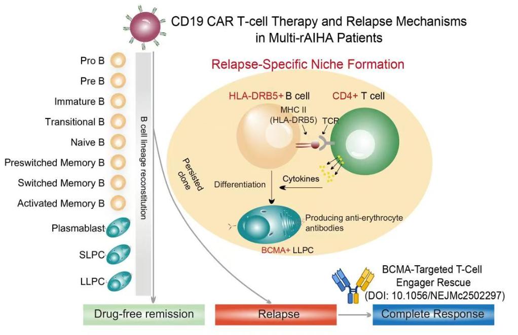 ??針對多線治療失敗的難治/復發(fā)性AIHA患者,研究團隊率先建立了細胞免疫治療新體系,利用我國自主研發(fā)的自體CD19 CAR T細胞進行治療,取得了顯著療效與良好的安全性,患者實現了長期無藥物治療緩解。對于少數CAR T治療后復發(fā)的患者,研究團隊進一步采用BCMA×CD3雙特異性抗體進行精準二次挽救治療,同樣取得了成功。