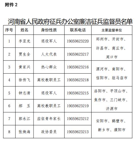河南省省市兩級廉潔征兵監(jiān)督舉報電話、信箱及省級監(jiān)督員信息