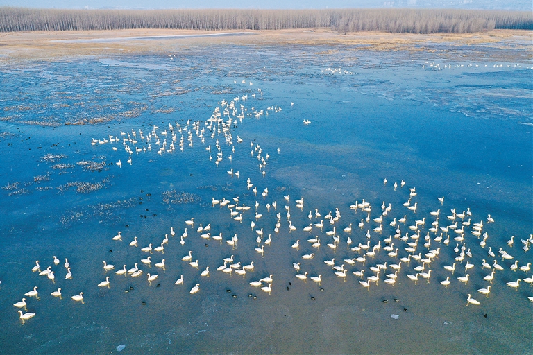 三門峽天鵝湖國家城市濕地公園,成群的白天鵝正在開闊水域中棲息游弋。河南省林業(yè)局供圖