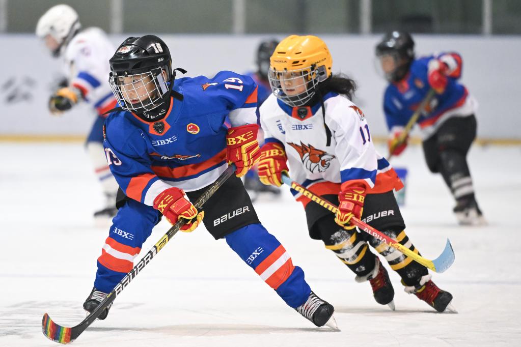 ??1月25日,在齊齊哈爾市的黑龍體育館內,二馬路小學翼虎冰球隊隊員劉金梓晨(左)在訓練中。新華社記者 張濤 攝