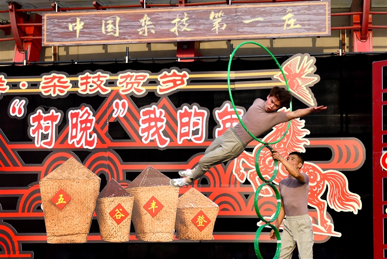 2月10日,濮陽(yáng)市華龍區(qū)岳村鎮(zhèn)東北莊雜技“村晚”現(xiàn)場(chǎng)。高崟人 攝