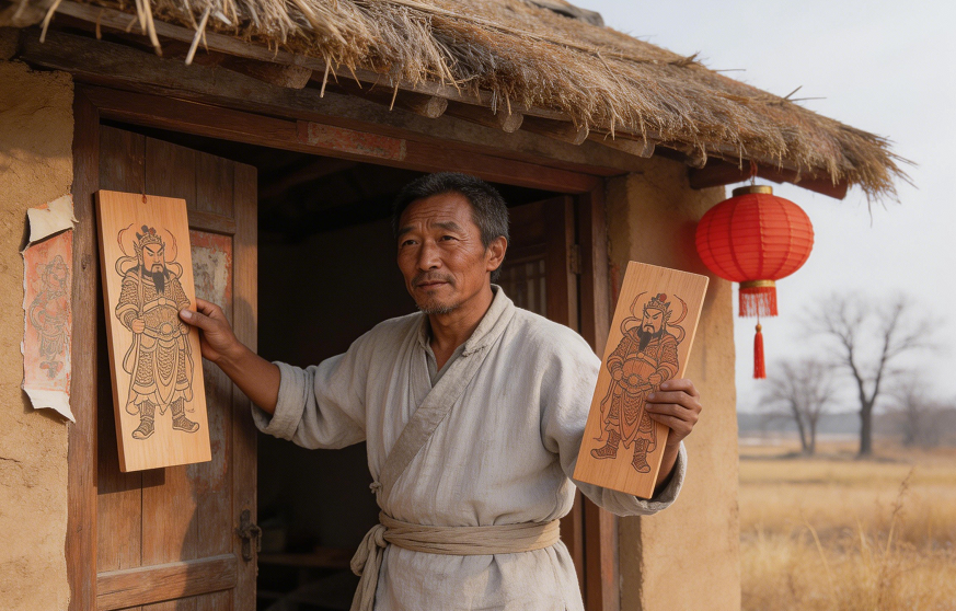 桃符、門神和春聯(lián),是一脈相承、層層演化的關(guān)系。在歷史上,還存在桃符、門神、春聯(lián)并存的情況。