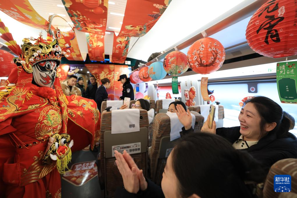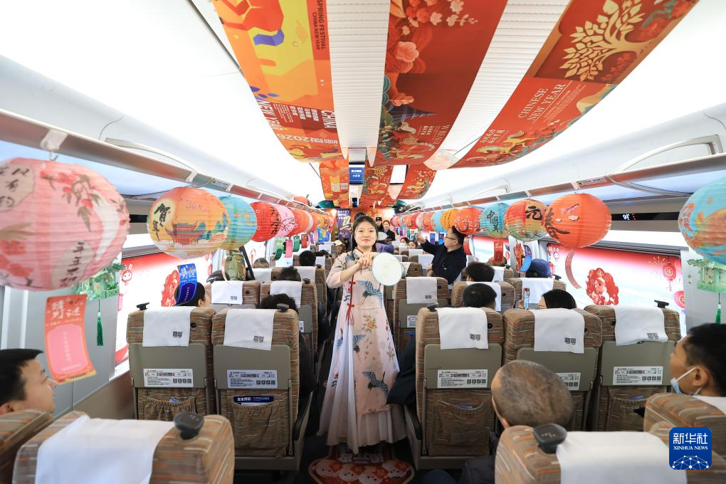 ??元宵節(jié)來(lái)臨之際,中國(guó)鐵路哈爾濱局集團(tuán)有限公司齊齊哈爾客運(yùn)段擔(dān)當(dāng)?shù)凝R齊哈爾南開(kāi)往天津西的G1280次列車上舉行“鬧元宵·話團(tuán)圓”主題活動(dòng),車廂內(nèi)張燈結(jié)彩,民族歌舞、舞獅、變臉等節(jié)目接連上演,讓旅途充滿節(jié)日溫情。新華社發(fā)(徐率 攝)