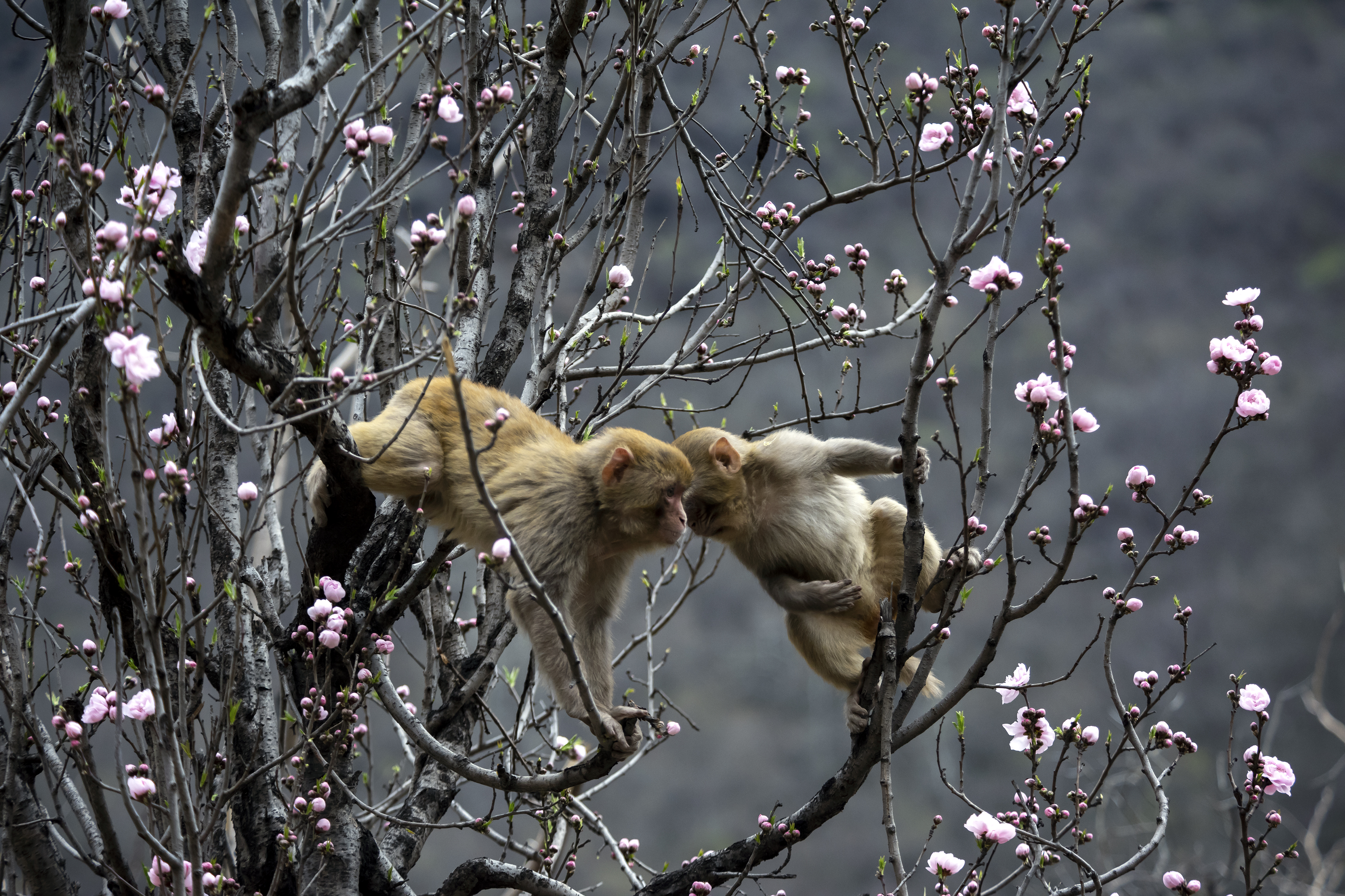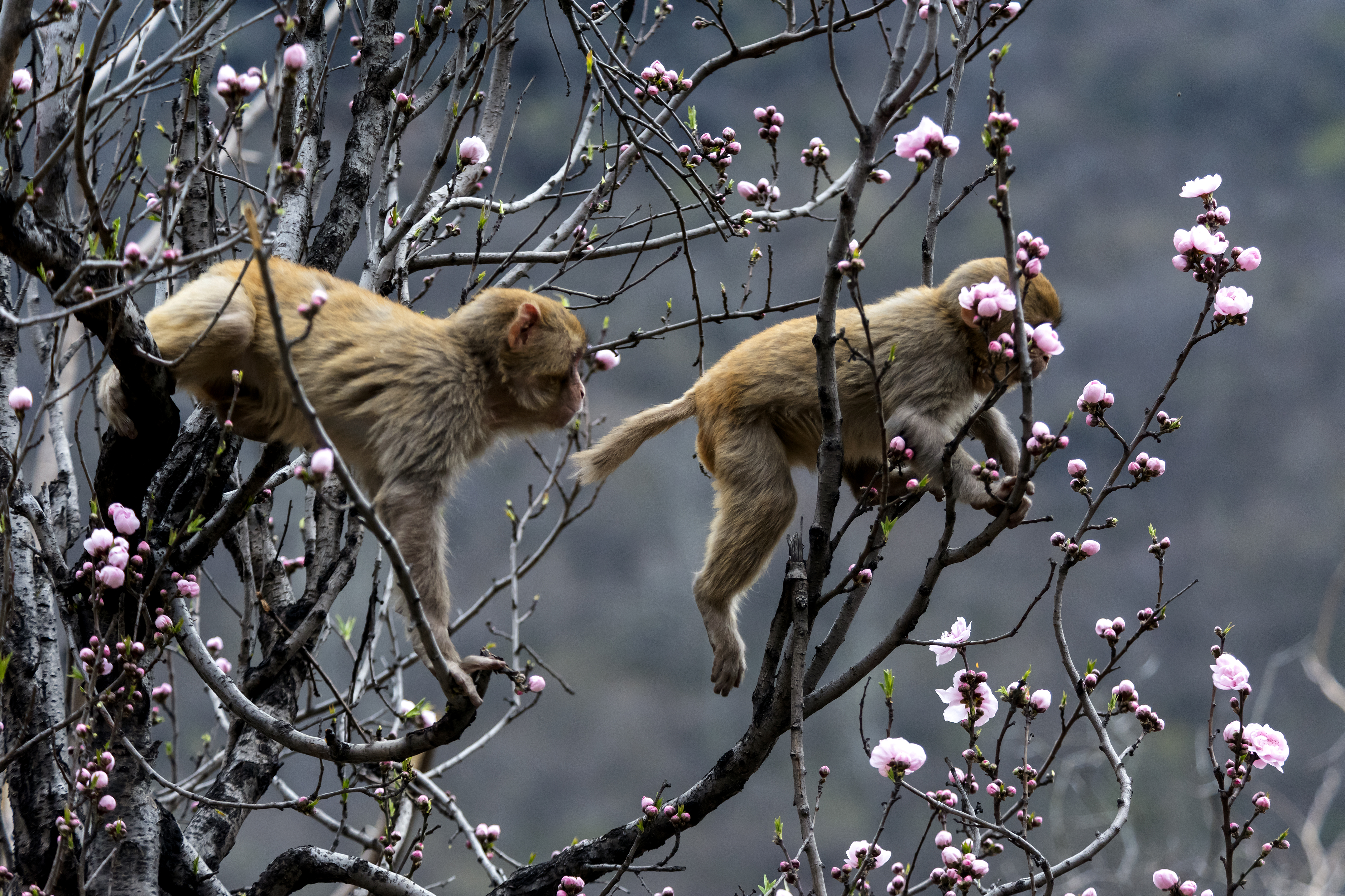 3月23日,河南濟(jì)源五龍口國家級獼猴自然保護(hù)區(qū)內(nèi),太行獼猴穿梭于青山繁花之中。這些“太行精靈”或嬉戲追逐、或攀枝躍動,與春日美景相映成趣,勾勒出一幅鮮活生動的生態(tài)畫卷。圖為太行獼猴在花叢中追逐嬉戲。