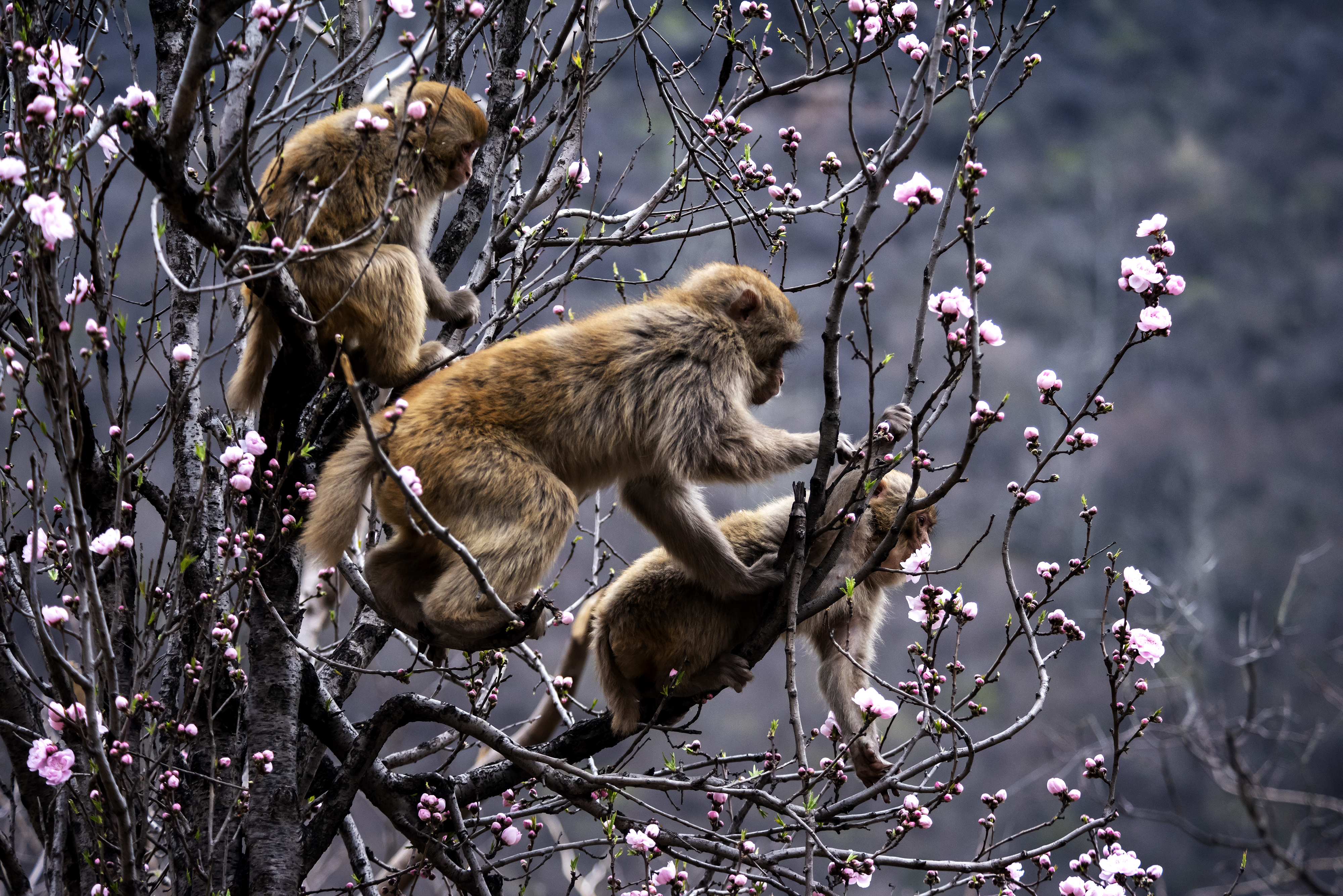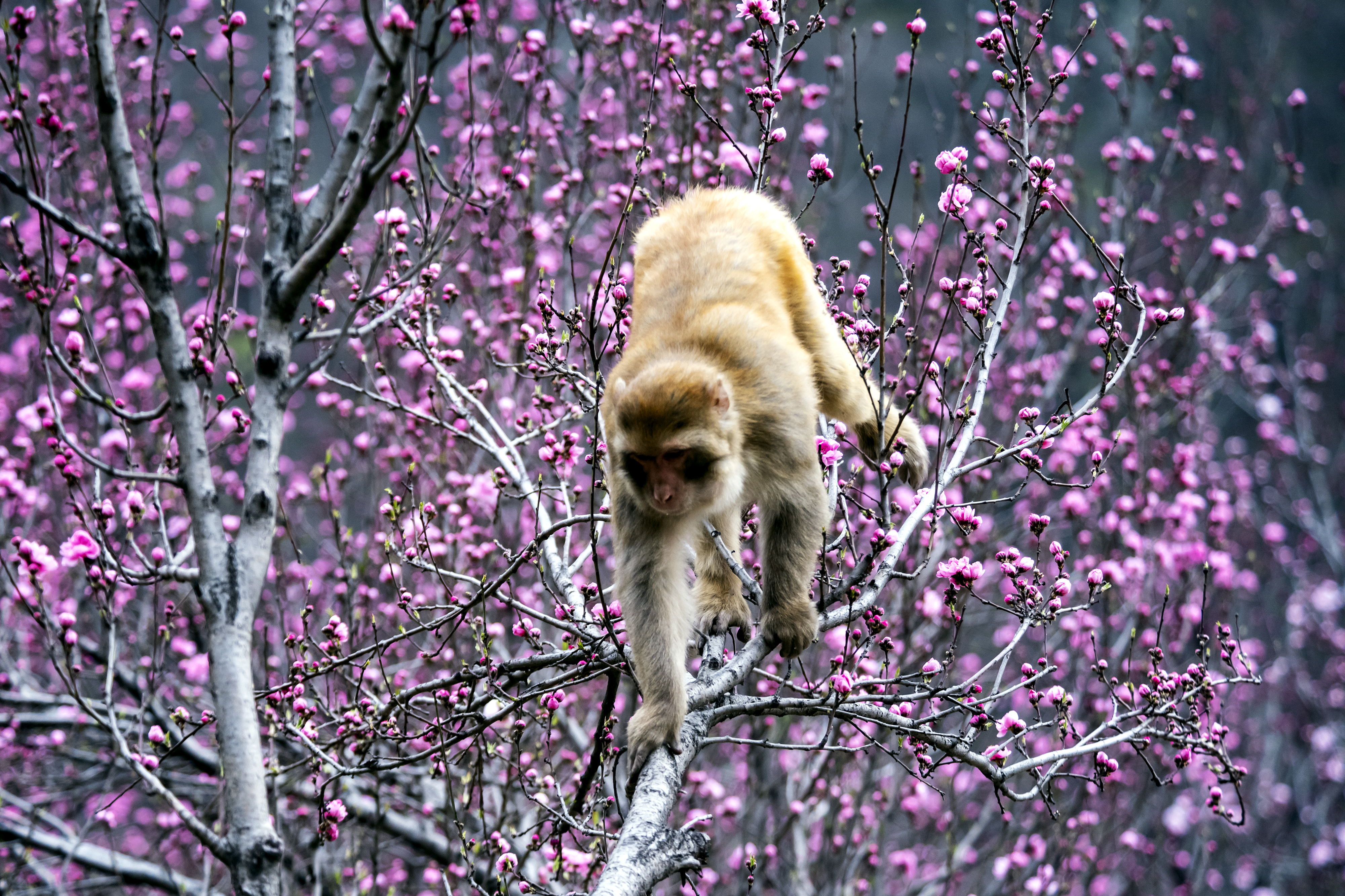 太行獼猴在樹枝上“賞花”。