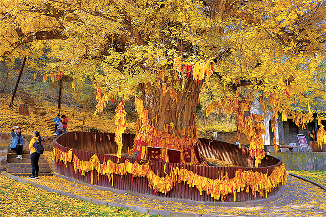 再前行,不僅是紅葉,千年銀杏也悄悄換上了金色的舞衣,輕撫紗袖,款款而來,和著風(fēng)聲,向游人悄悄細(xì)語。遠(yuǎn)看,好似一片金色的霞光,那些葉子,在風(fēng)中飄落,似無數(shù)只金色的蝴蝶漫天飛舞,引得游人紛紛駐足觀賞;飄落地上,又好似為大地鋪上了一層金色的地毯,松軟,迷人,把大地裝扮得格外亮麗。