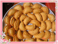 油角 一種油炸食品。將面粉加開水?dāng)嚭?,做成面片,包入粉條、豆腐、豆芽拌成的素餡,然后將面片兩邊的捏在一起,成花紋狀,放入油鍋中炸制而成。其形呈月牙狀,猶如牛角,故稱油角。油角外酥里香,營養(yǎng)豐富,一直以來都是濟(jì)源人走親訪友的特色食品?! ?/p>