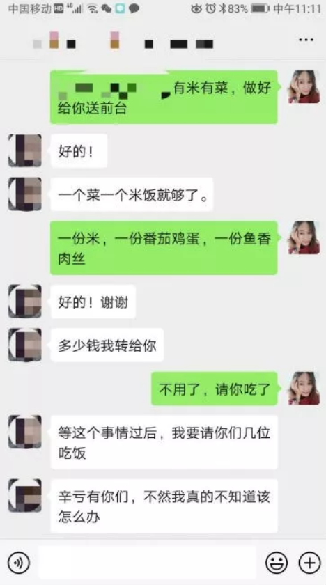 接下來的幾天,李爽不斷詢問小李的生活情況,一再叮囑:“想吃什么、生活用品缺啥,給我說。”楊建偉也特意關(guān)照酒店樓下的超市,給小李送來礦泉水和水果。1月29日下午,小李在回答李爽的問候時言及想吃米飯,李爽馬上蒸了米飯、炒了番茄雞蛋和魚香肉絲送去。當(dāng)小李提出要付飯錢時,李爽搖頭:“姐請你吃了?!?/p>