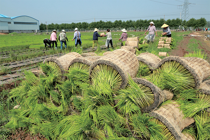 6月18日,工人在五龍口鎮(zhèn)西正富硒水稻產(chǎn)業(yè)園起秧苗。