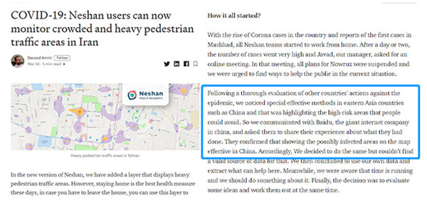 而中國的防控經(jīng)驗也為其他國家提供了借鑒。在3月30日,伊朗最受歡迎的地圖導航類App——有著400多萬裝機用戶的Neshan Maps發(fā)文表示,Neshan用戶現(xiàn)在可通過查看人員密度的熱力圖來避免前往或途經(jīng)人員密集地。在提到Neshan Maps是如何將抗疫想法付諸實踐時,團隊表示在最初評估其他國家如何抗疫時,他們注意到中國等東亞國家采取了特別有效的方法,那就是在地圖中讓可以避免的高風險地區(qū)更為醒目,因此他們與百度溝通并請他們分享經(jīng)驗,從而為伊朗民眾科學防疫、安全出行提供了參考?! ?/p>