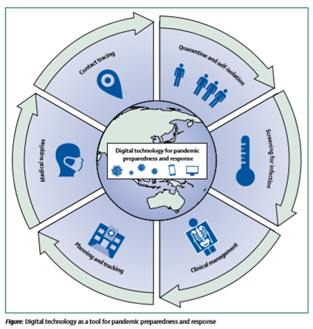 自疫情發(fā)生以來,多國將大數(shù)據(jù)、人工智能、機器學習等數(shù)字技術用于防疫抗疫。6月29日,《柳葉刀》發(fā)表《數(shù)字技術在COVID-19大流行病計劃制定和應對中的應用》一文,文章總結(jié)了一些國家在疫情中是如何將數(shù)字技術應用于計劃制定和行跡追蹤、感染者篩查、密切接觸者追蹤、隔離與自我隔離、門診管理、醫(yī)療物資供應這六個方面,從而精準防控疫情蔓延并為醫(yī)療工作提供協(xié)助。