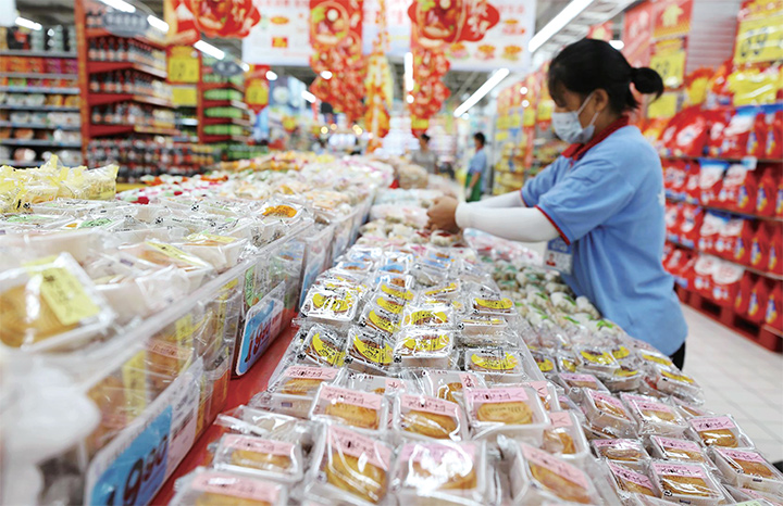 超市工作人員在整理月餅