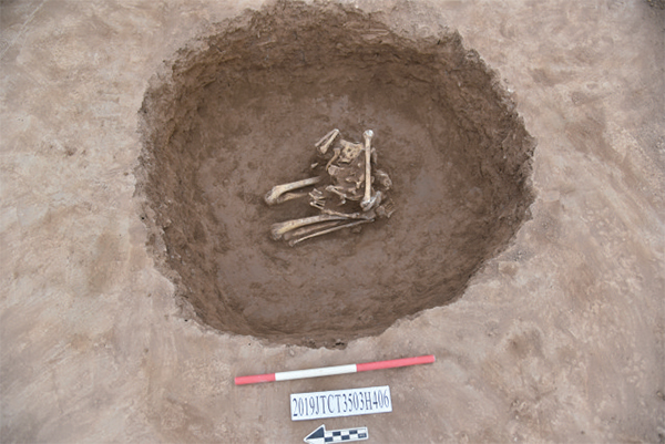 2020年4月,在濟(jì)源柴莊遺址的發(fā)掘過(guò)程中,考古人員發(fā)現(xiàn)了罕見(jiàn)的“坎”字形人祭坑。人祭遺存身首異處,面朝北方,雙膝跪于坑內(nèi),兩手交叉放在身前,保存較為完整。