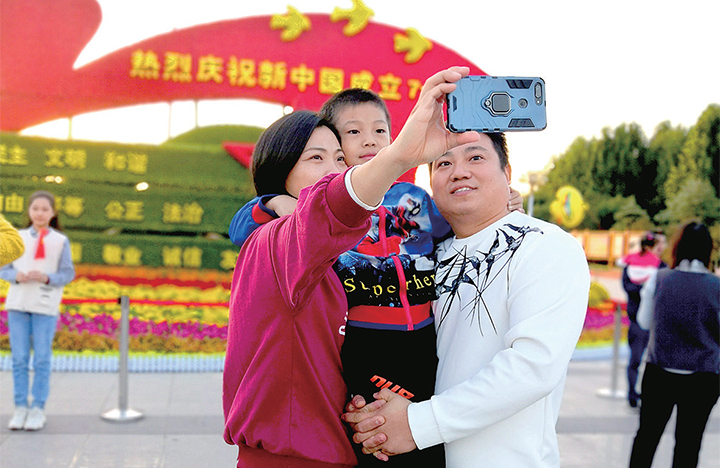 在世紀(jì)廣場(chǎng)國(guó)慶花壇前,市民紛紛拍照留念。
