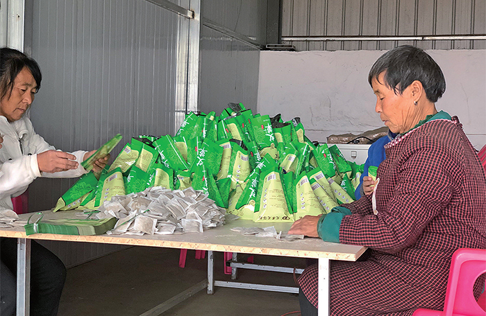 10月18日,在下冶鎮(zhèn)大嶺村農(nóng)民專業(yè)合作社,工人忙著將加工好的艾草足浴包分揀、裝袋。