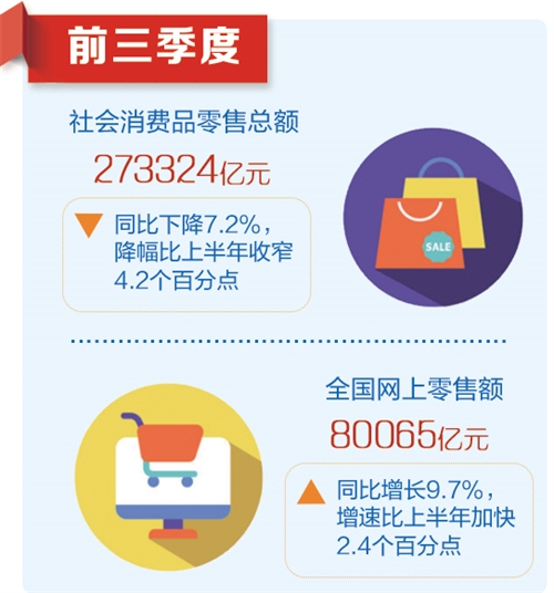 市場銷售季度增速由降轉(zhuǎn)增。前三季度,社會消費品零售總額同比下降7.2%,降幅比上半年收窄4.2個百分點。其中,三季度社會消費品零售總額同比增長0.9%,季度增速年內(nèi)首次轉(zhuǎn)正。