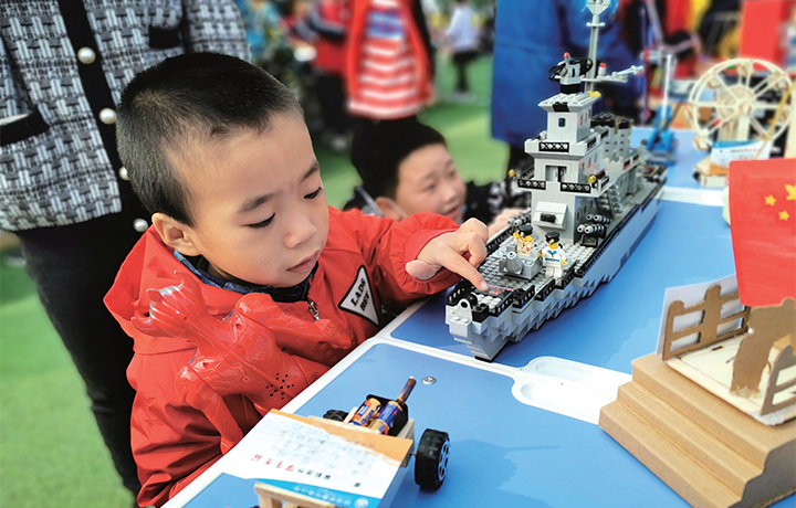 10月29日,小朋友在濟源2020年(第五屆)“大象杯”學??萍脊?jié)上觀看青少年科技創(chuàng)新成果作品。