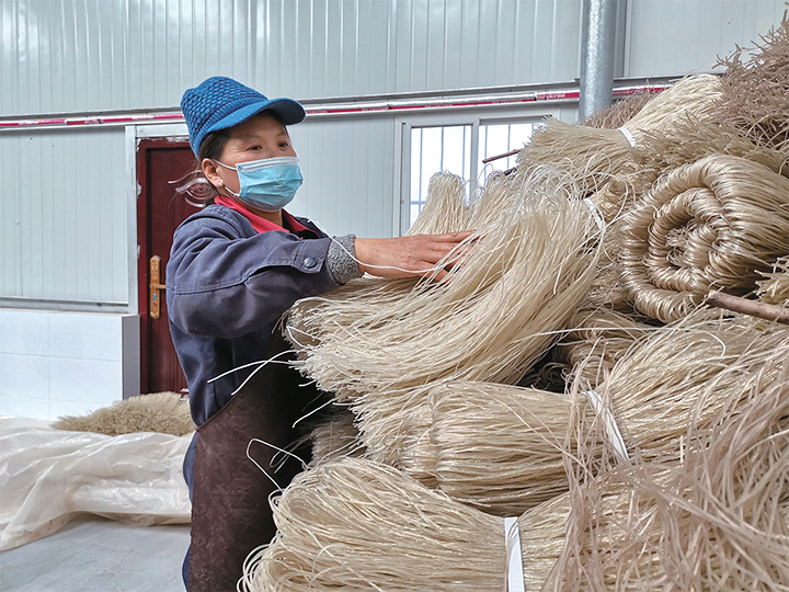 在紅薯加工廠打工的村民張?zhí)泼髡f:“現(xiàn)在是旺季,來加工粉條的群眾比較多,有時(shí)候需要加班到深夜才能完成訂單。紅薯一天的加工量近3萬斤,能產(chǎn)出2000余斤粉條?!?/p>