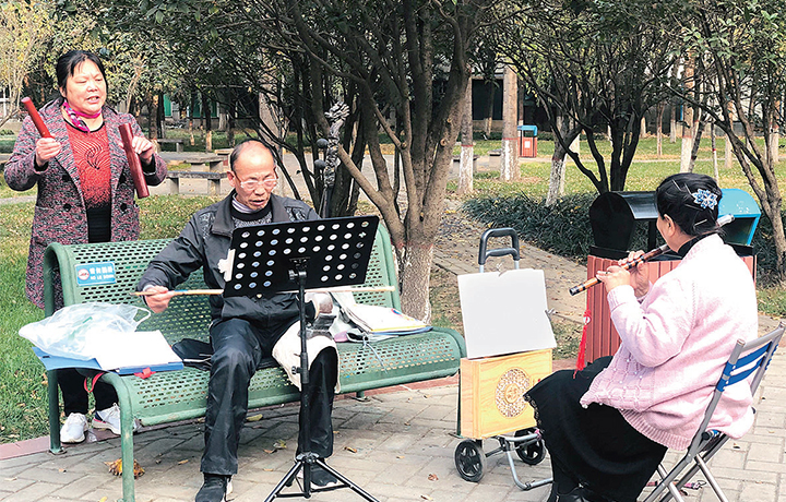 11月14日,暖陽高照,天氣晴好。文昌路與黃河大道交叉口的小游園內(nèi),老年人聚在一起排練戲曲。