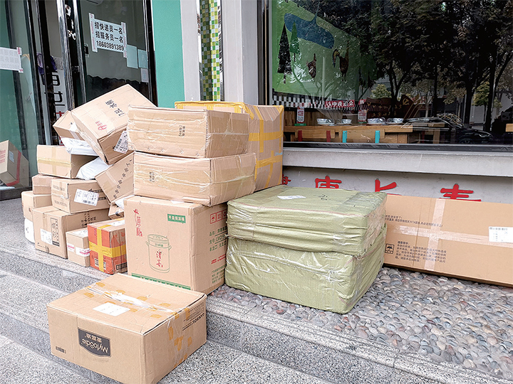 昨日上午11時(shí),記者來(lái)到靳小鵬所居住的小區(qū),看到小區(qū)超市門(mén)口擺放著許多快遞?!昂⒆釉诠ぷ?,沒(méi)時(shí)間來(lái)拿,我們是替孩子來(lái)拿快遞的?!笔忻窭畎⒁探榻B,對(duì)于拆下來(lái)的快遞包裝,她一般會(huì)將其保留,放置在家里,待積攢到一定數(shù)量后,統(tǒng)一賣掉。