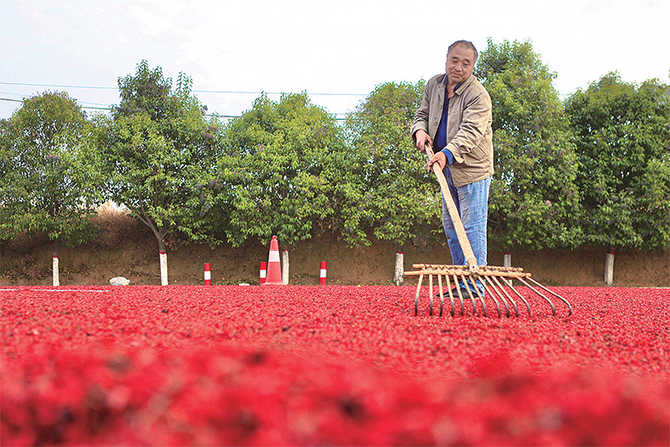 初冬時節(jié),坡頭鎮(zhèn)的山茱萸喜獲豐收。村民忙著晾曬山茱萸,臉上洋溢著豐收的喜悅。記者 劉培琳 攝