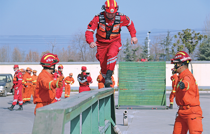應(yīng)急救援隊隊員正在穿越獨木橋