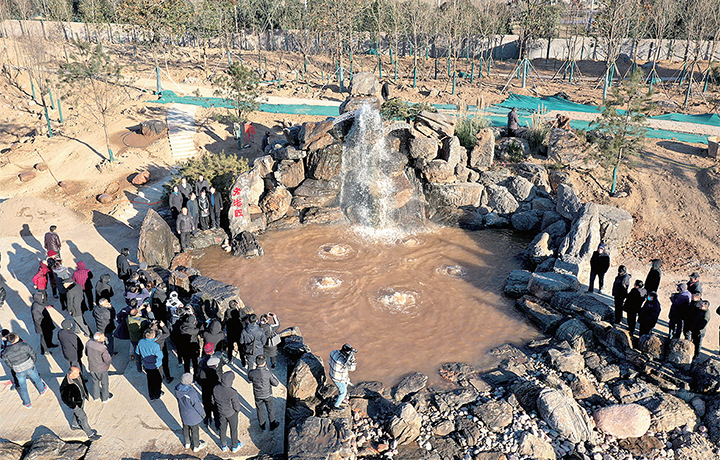 “老海眼出水了!”12月30日上午9點(diǎn)9分,位于濟(jì)源城區(qū)西北角、延慶寺西南側(cè)的龍?zhí)逗_(kāi)始注水。瞬時(shí),濟(jì)水之源老海眼泉水噴涌而出。在陽(yáng)光的照射下,水面波光粼粼。周邊一些了解歷史,尤其是上了年紀(jì)的居民格外關(guān)注,不顧嚴(yán)寒前來(lái)觀看。