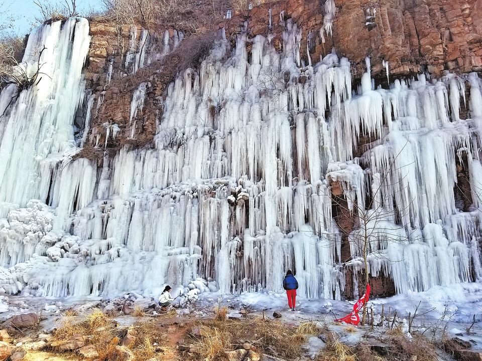 1月12日,游客在位于濟源大峪鎮(zhèn)亂石村的大型冰掛前拍照游玩。記者 成利軍 攝