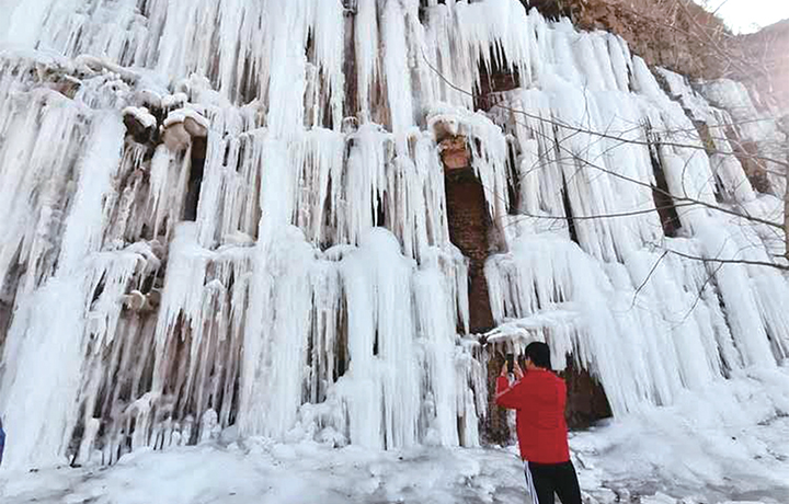 1月13日,在大峪鎮(zhèn)硯瓦河畔,游客欣賞美麗的冰掛。