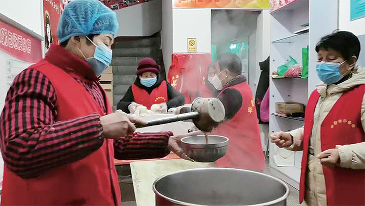 “來來來,大家戴好口罩,注意間隔一米距離。”早上6點半左右,志愿者開始招呼著環(huán)衛(wèi)工、殘疾人、空巢老人等社會群體有序測溫、領粥。