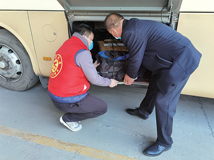 2月8日,志愿者幫助乘客放置行李。