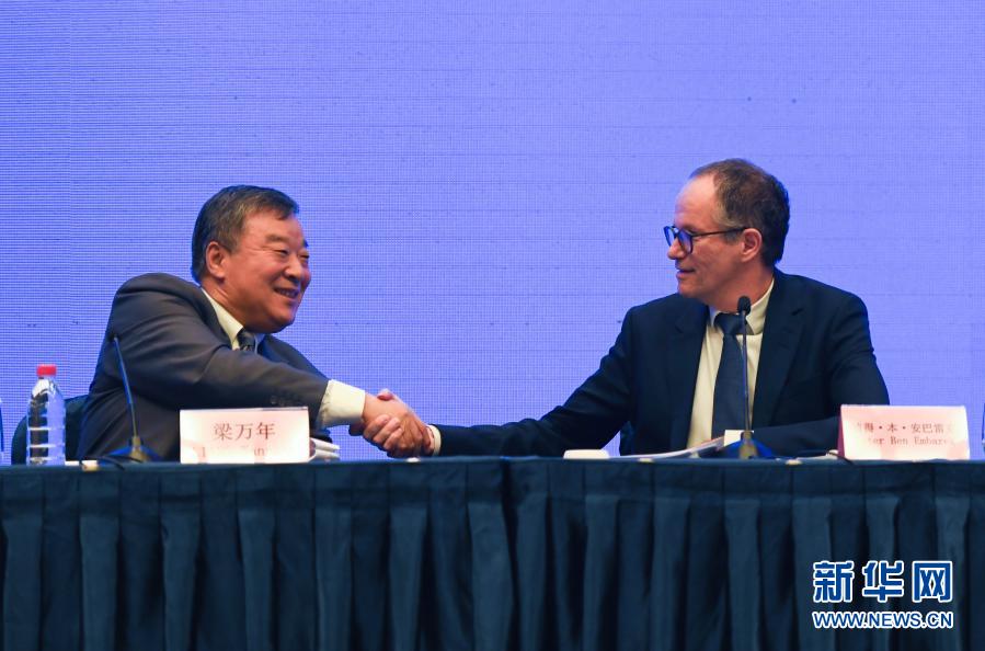 2月9日,聯(lián)合專家組中方組長(zhǎng)梁萬(wàn)年(左)和聯(lián)合專家組外方組長(zhǎng)彼得·本·安巴雷克握手。新華社記者 程敏 攝
