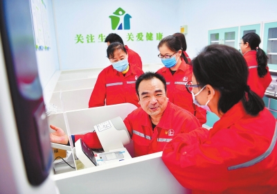 中原油田文衛(wèi)采油廠員工在“職工健康驛站”測量血壓。資料圖片