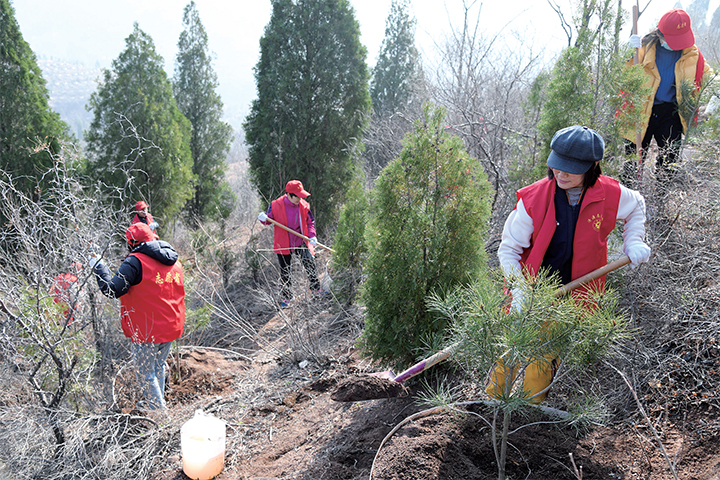 3月9日,志愿者在黃河小浪底庫(kù)區(qū)北岸沿黃生態(tài)涵養(yǎng)帶植樹。